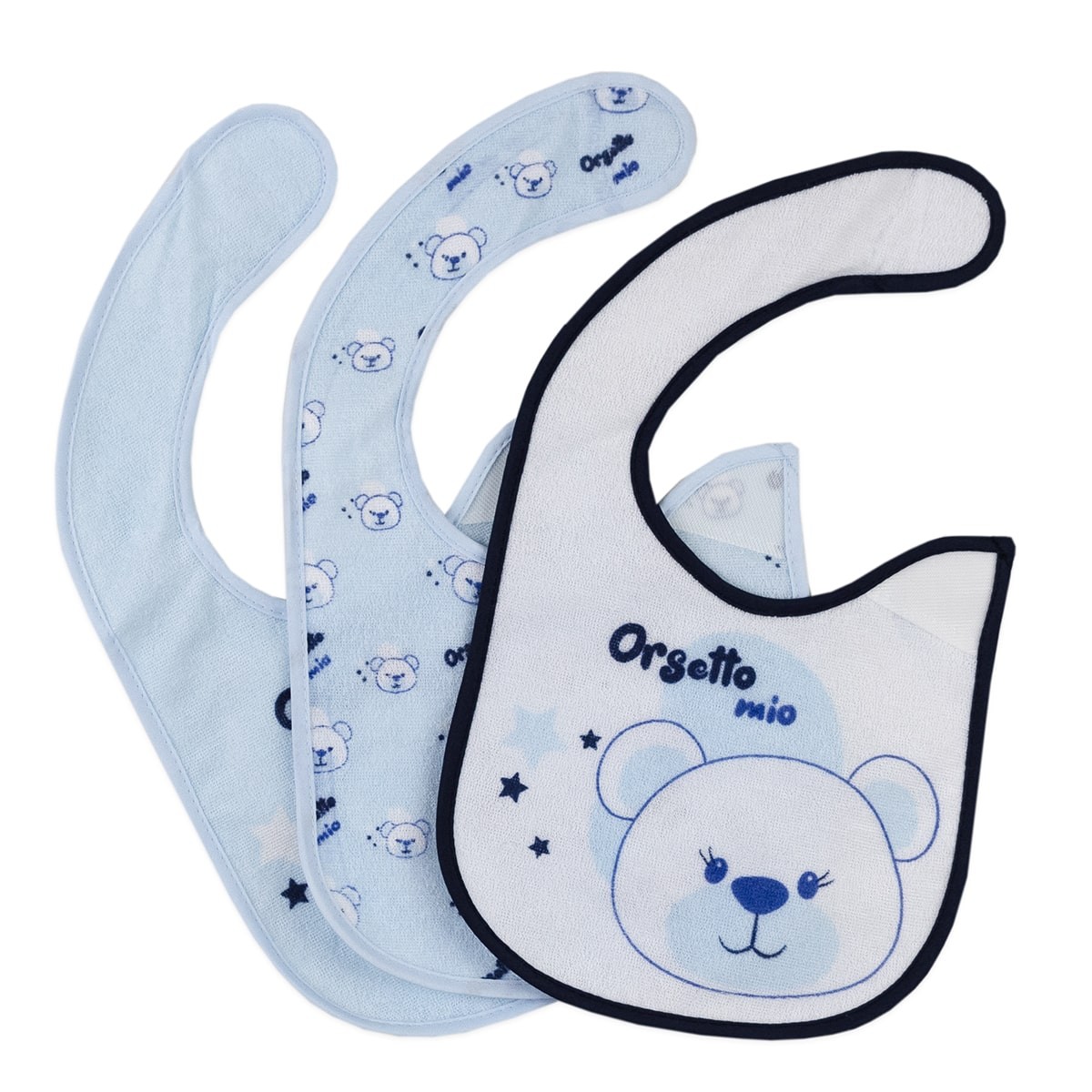Set of 3 round-shaped cotton terry bibs with stain-resistant back and central print with a cute little bear.