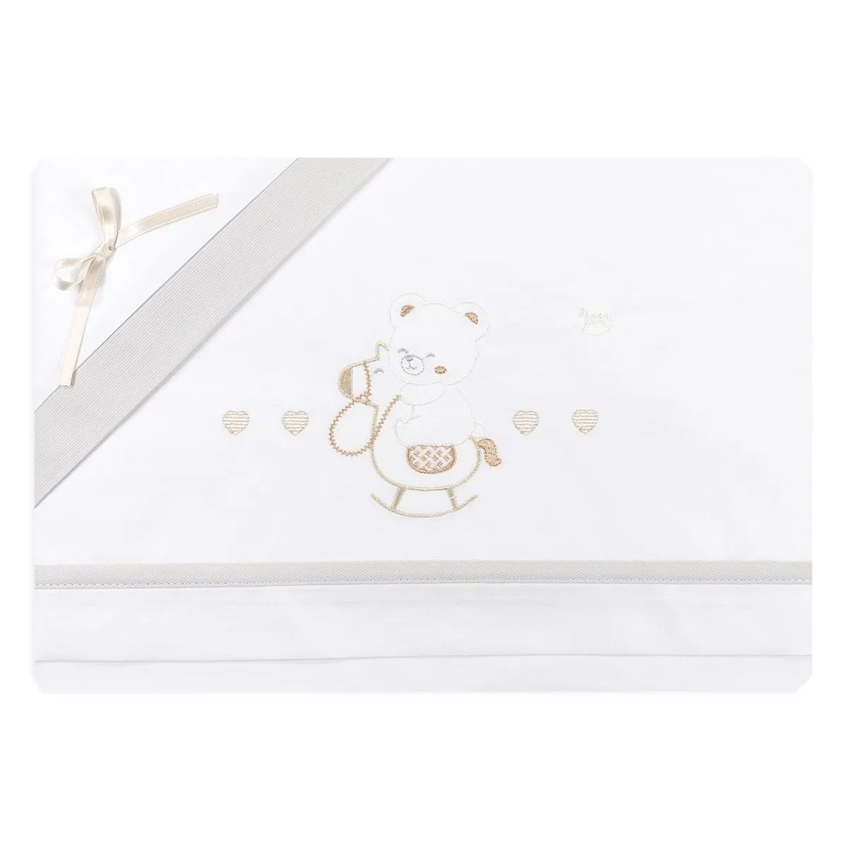 Three-piece cot crib sheet set in 100% pure cotton finished with a cute teddy bear playing with an embroidered rocking horse and solid color piqué border.
