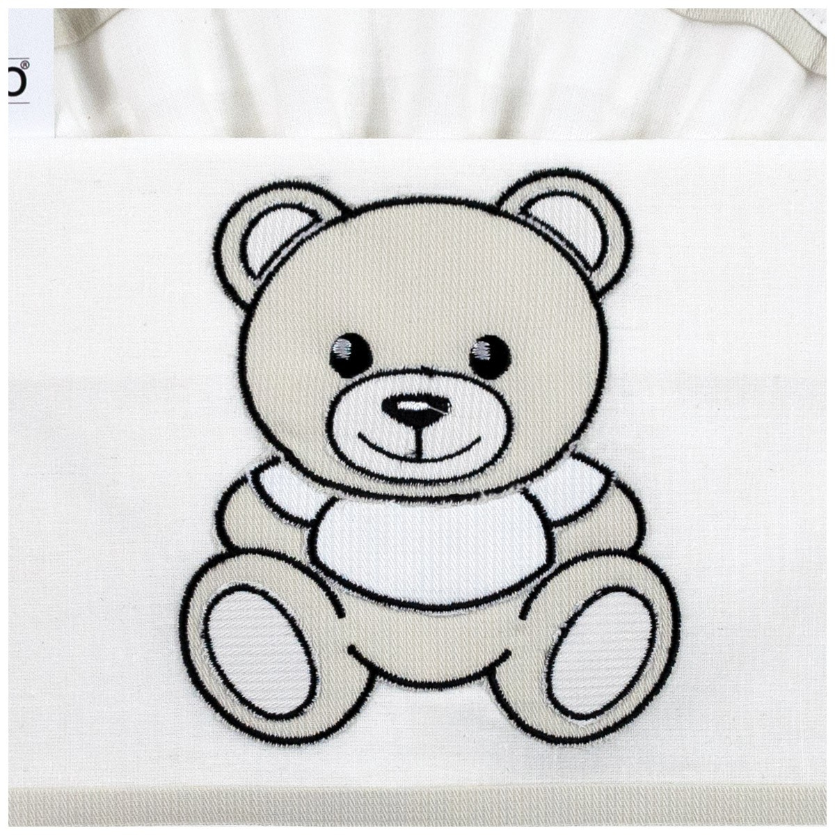 The finishes are carefully crafted down to the smallest detail, with durable stitching and precise edging. The teddy bear embroidery is accurately applied to the top sheet, enhancing the overall look of the cot. The fabrics undergo treatments that increase softness and dimensional stability.