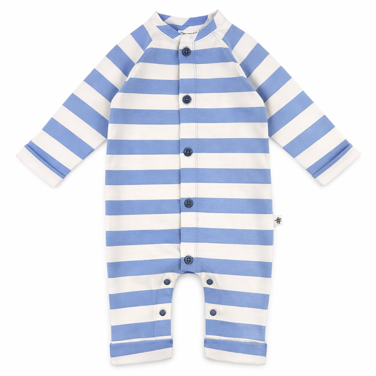 Organic cotton jersey baby sleepsuit with aviator blue and ecru stripes