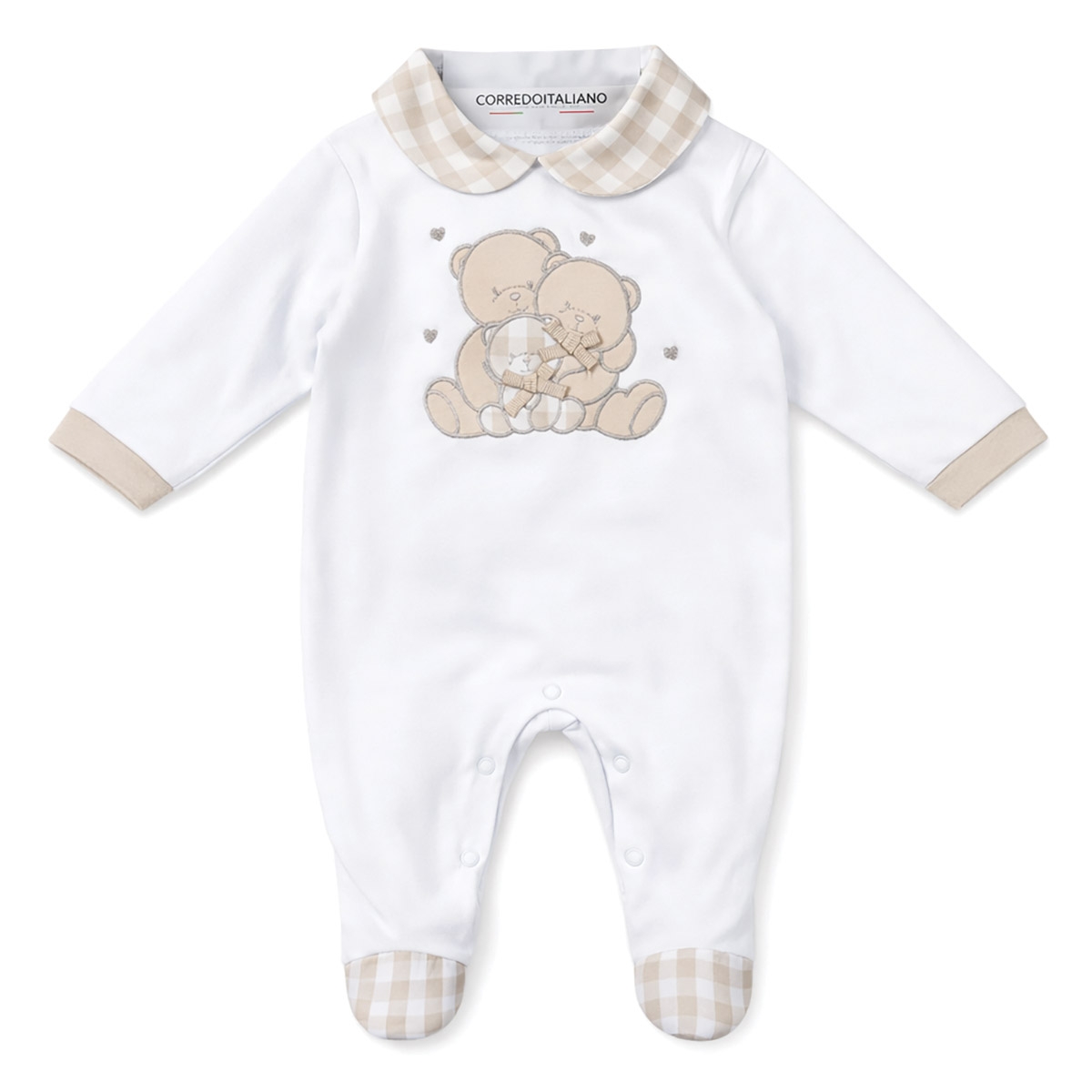 The newborn romper in fresh cotton from the Les Jolies collection is designed to accompany the baby’s first months with comfort and softness. The clean and harmonious design is enhanced by a gingham-pattern collar and a central embroidery featuring sweet teddy bears, giving the romper a delicate and timeless style. Ideal for both everyday wear and special occasions, this romper combines practicality with refined aesthetics, offering a soft and comfortable fit designed to support the newborn’s well-being throughout the day.
