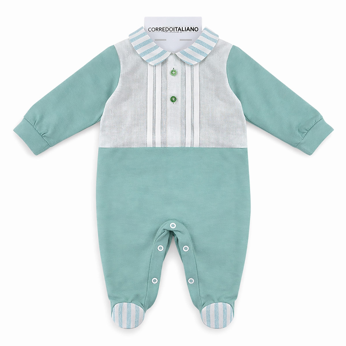 The newborn romper from the Klaiadi collection is designed to offer comfort, practicality, and elegance during the first months of life. Made from soft jersey cotton with refined linen-blend inserts, it stands out for its clean design and carefully crafted details. The striped coordinated collar, decorative front buttons, and delicate color combination make this romper ideal for both everyday wear and special occasions. Designed for a newborn’s sensitive skin, it ensures breathability, a comfortable fit, and freedom of movement, naturally accompanying the baby throughout the day.