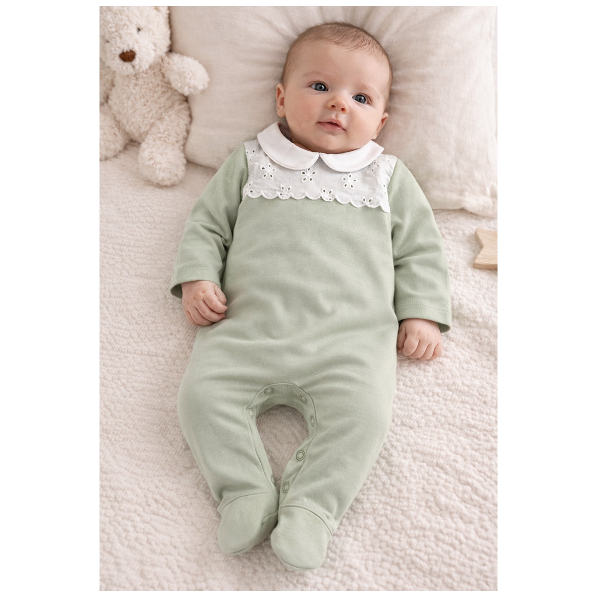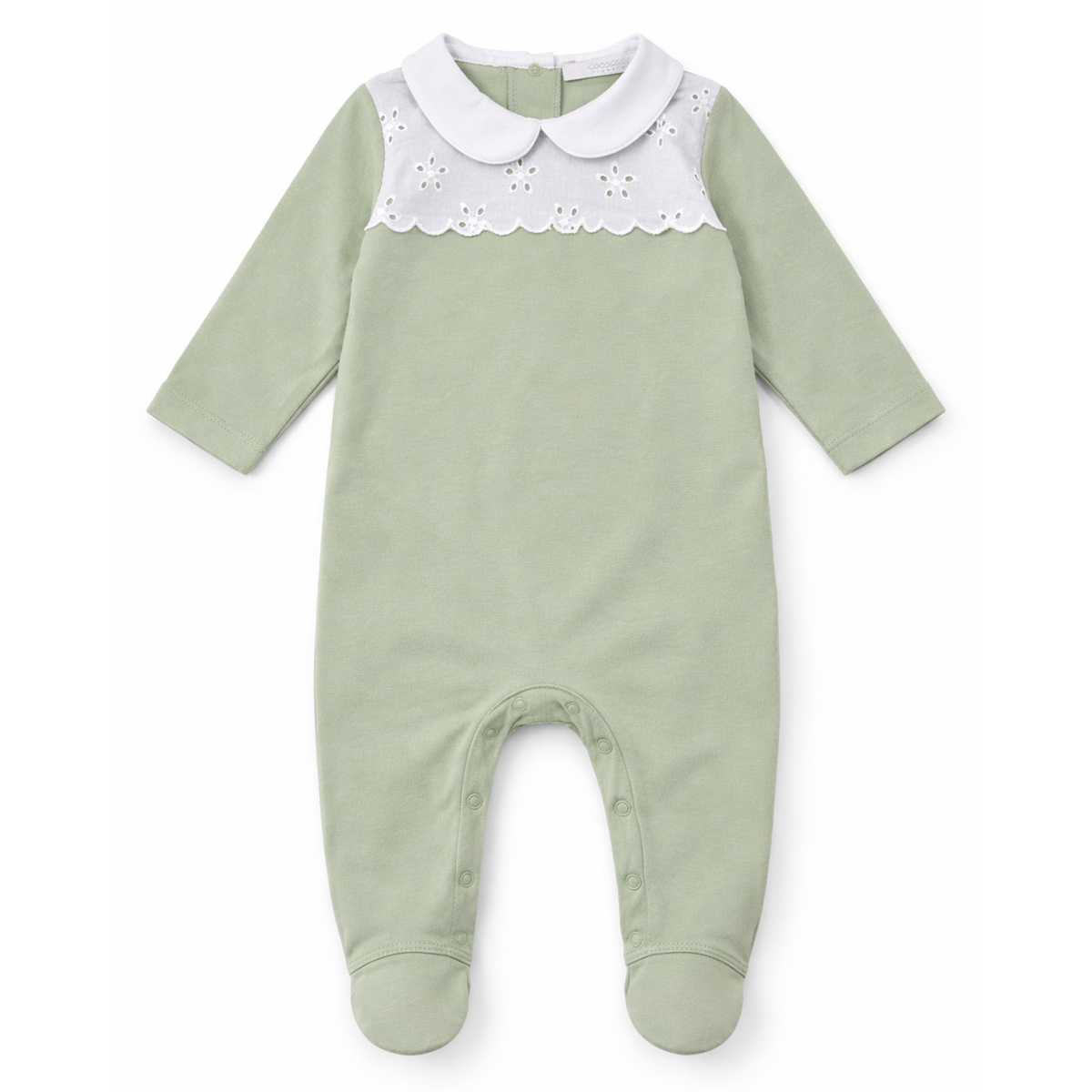 Baby Girl Sage Green Sleepsuit in Cotton Jersey and San Gallo – Coccode Collection