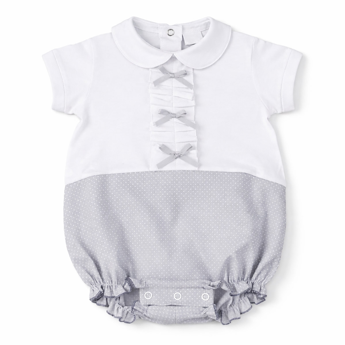 Cotton baby romper with collar and pleated details, finished with decorative bows and a polka dot piqué bottom, soft and gentle on delicate skin.