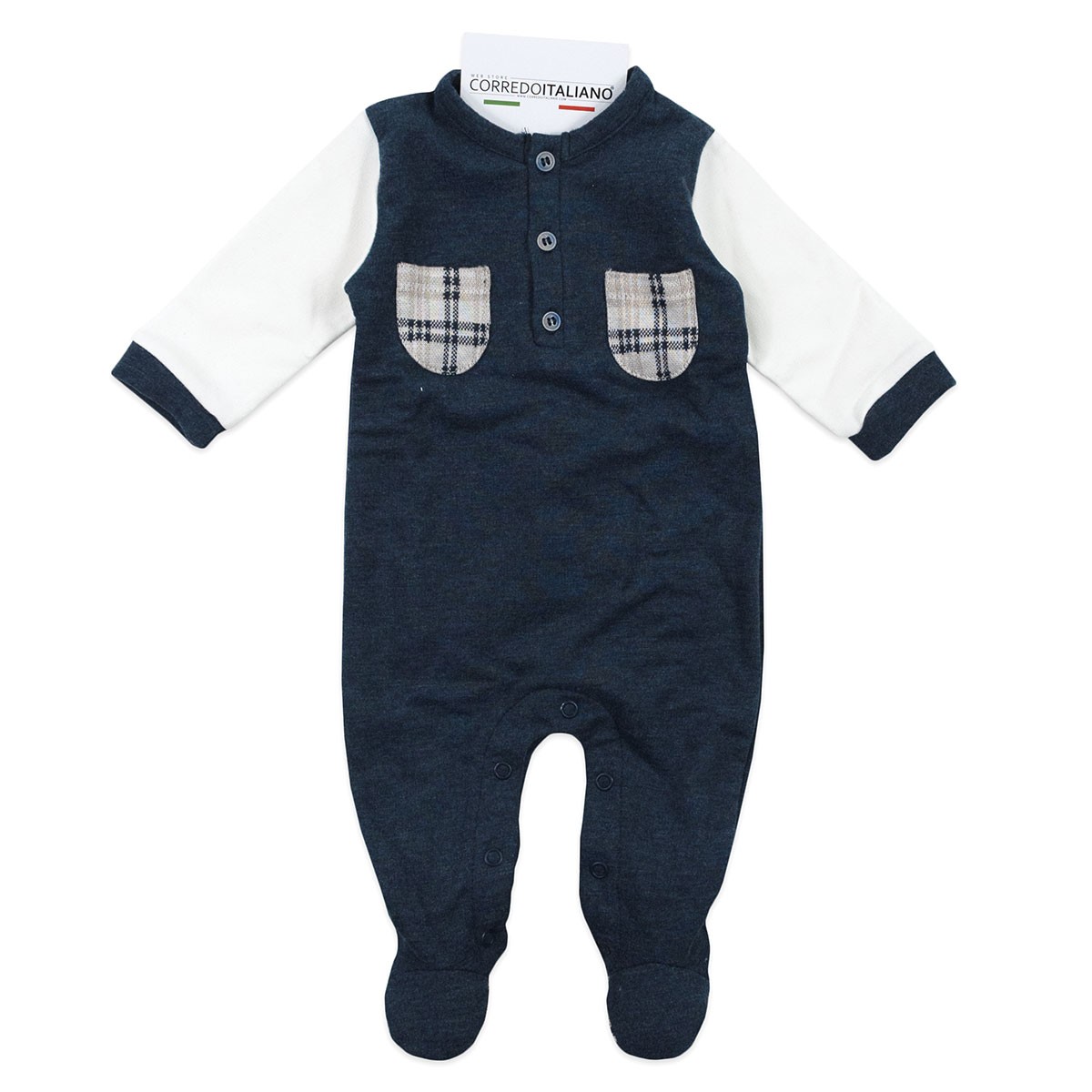 The Coccode’ romper features a front opening with snap buttons for easy changing and checked front pockets that add a chic touch. The long sleeves and integrated feet provide uniform warmth, while the breathable fabric prevents overheating. Perfect for everyday wear or as an elegant outfit for your baby’s first outings.