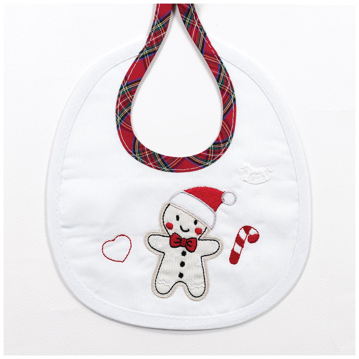The bib is crafted with exceptional attention to detail: the embroidery of the gingerbread man and the candy cane is executed with high precision, ensuring a defined and long-lasting result. The tartan Christmas border adds an elegant and traditional touch, while reinforced stitching guarantees durability even with frequent use.