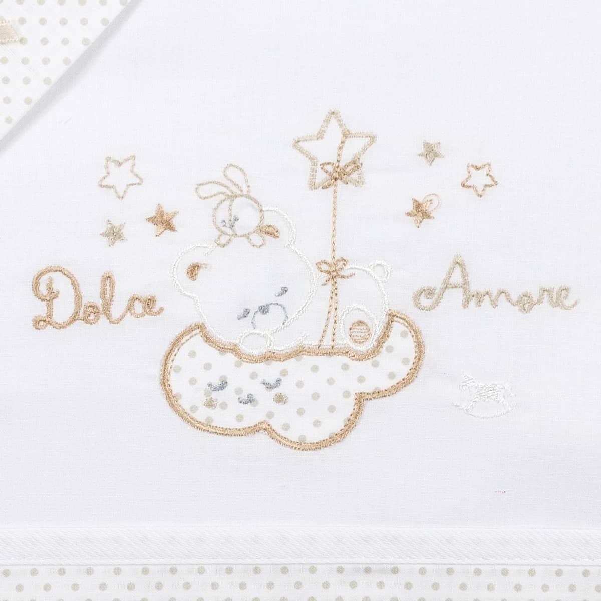 The central embroidery depicts a charming scene with a teddy bear tenderly sleeping on a soft polka-dotted cloud, holding a star.