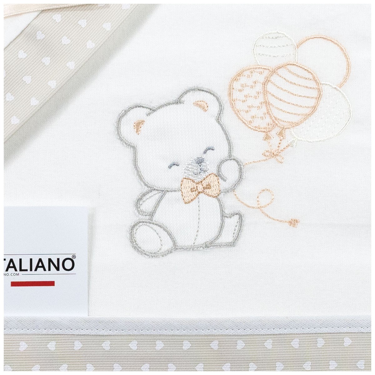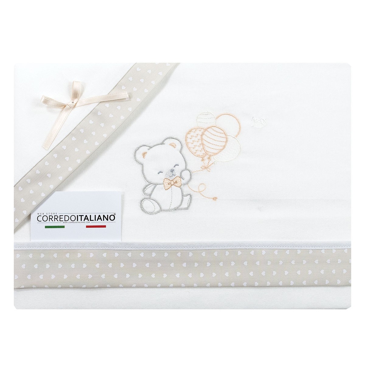 This sheet set stands out for its romantic and refined style. The sweet embroidered teddy bear with balloons and the delicate polka dots add a touch of sweetness and tenderness to the newborn’s layette. Perfect also as a newborn gift idea, it completes the baby’s cradle or stroller with elegance and Italian quality.