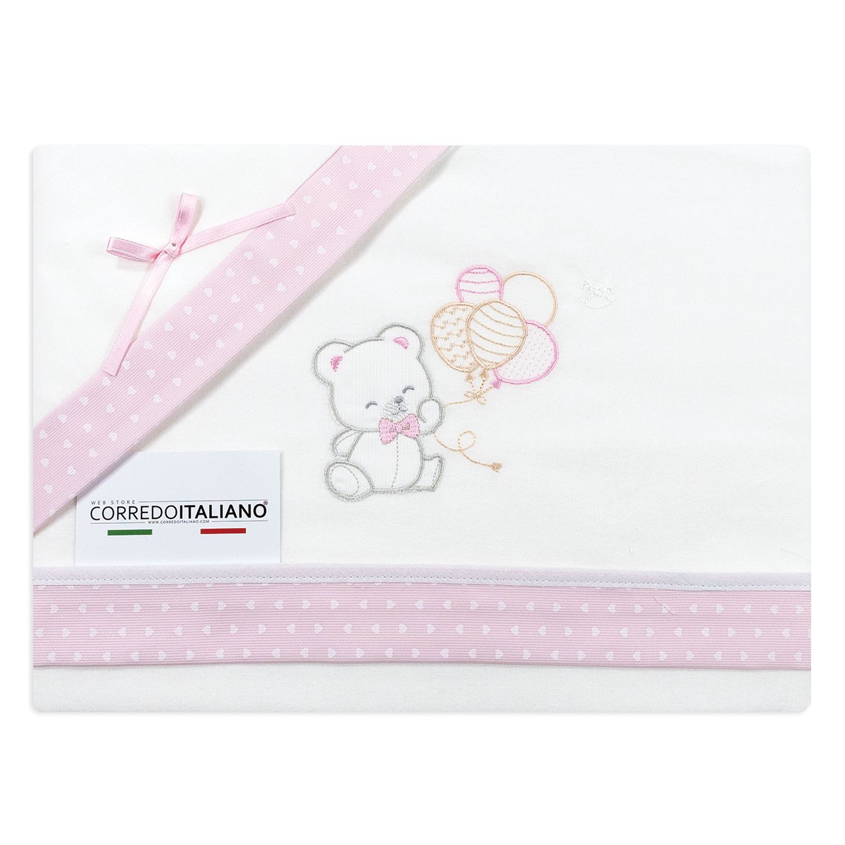 This sheet set stands out for its romantic and refined style. The sweet embroidered teddy bear with balloons and the delicate polka dots add a touch of sweetness and tenderness to the newborn’s layette. Perfect also as a newborn gift idea, it completes the baby’s cradle or stroller with elegance and Italian quality.