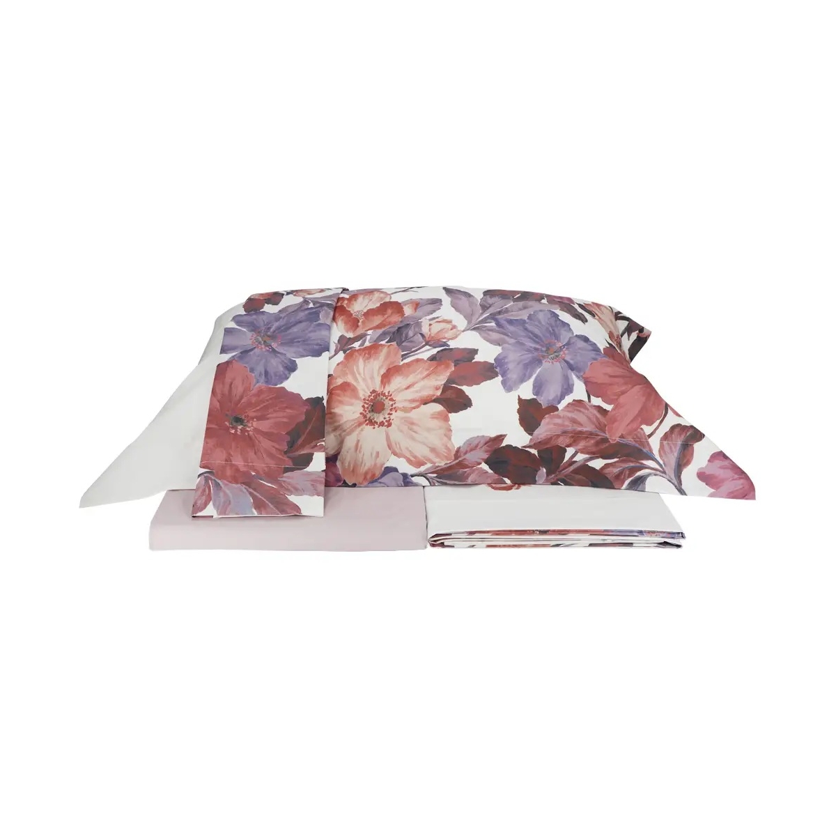 The Divine bed sheet set from the Gabel collection dresses the bed with delicate, contemporary elegance. The floral print, inspired by watercolor brushstrokes, blends powder pink, mauve, and plum shades on a luminous background, creating a refined yet easy-to-match visual effect. Made from percale cotton, it is designed for those seeking a fresh, dry feel on the skin, with the compact and neat texture typical of tightly woven fabrics. An ideal set to refresh the bedroom with style while maintaining everyday practicality and the textile quality signed by Gabel.