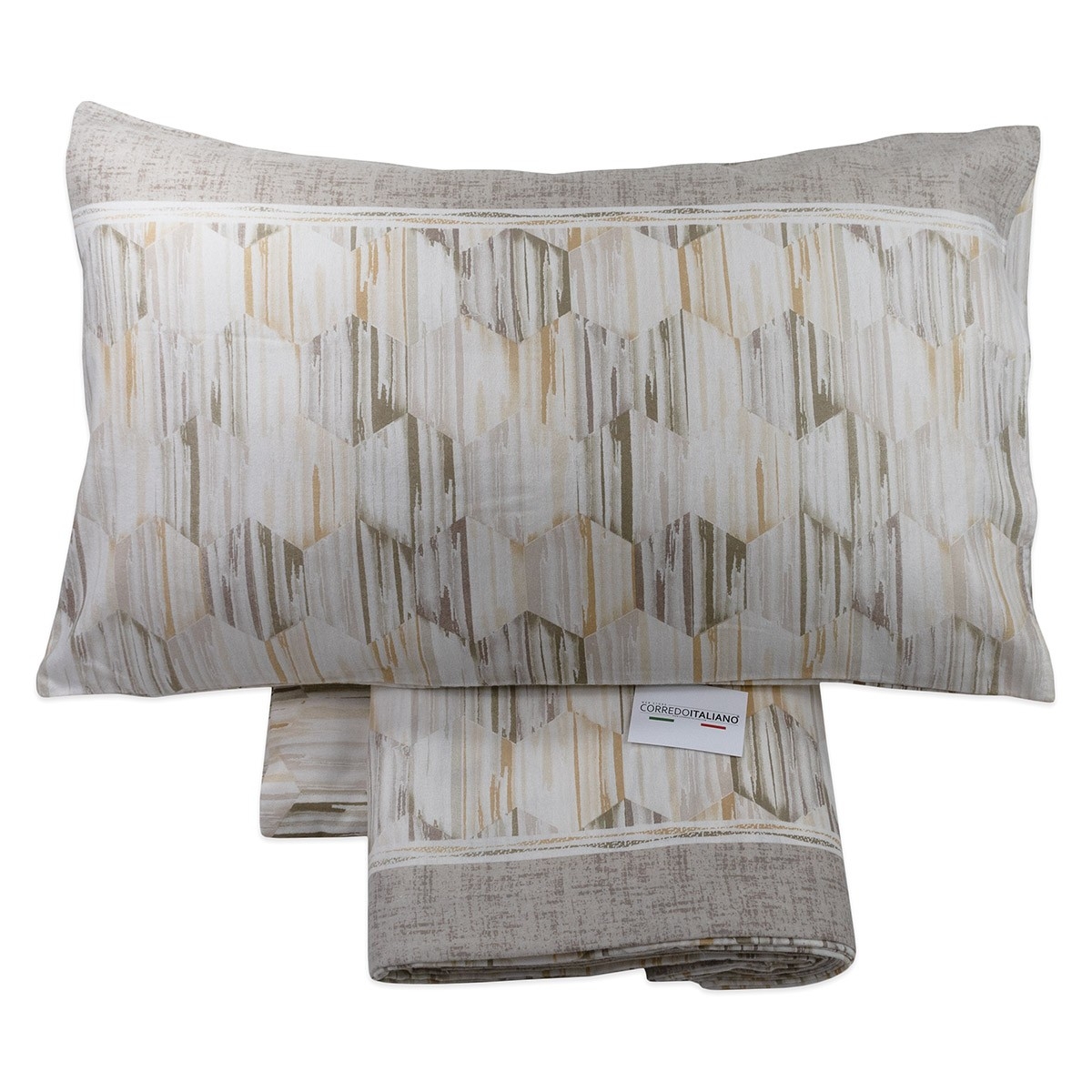 The Bucarest double flannel bed sheet set by Corredo Italiano® – “Le Flanelle” Collection combines the enveloping warmth of flannel with the artisanal quality of Made in Italy. Crafted from pure cotton flannel, this bedding set offers an exceptionally soft and cozy touch, ideal for the colder months. The geometric design in delicate shades of pink, lilac, and ivory adds a refined and contemporary touch to your bedroom decor.