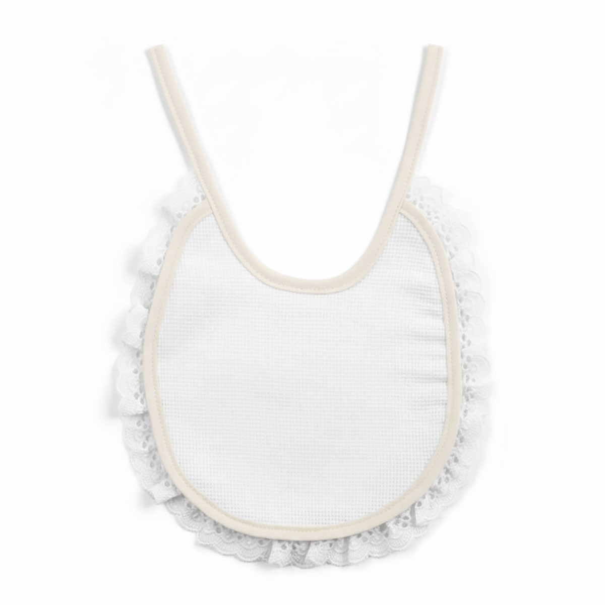 Elegant bib for babies made of 100% pure cotton, lined in pure cotton on the back and front in aida canvas for personalized embroidery.