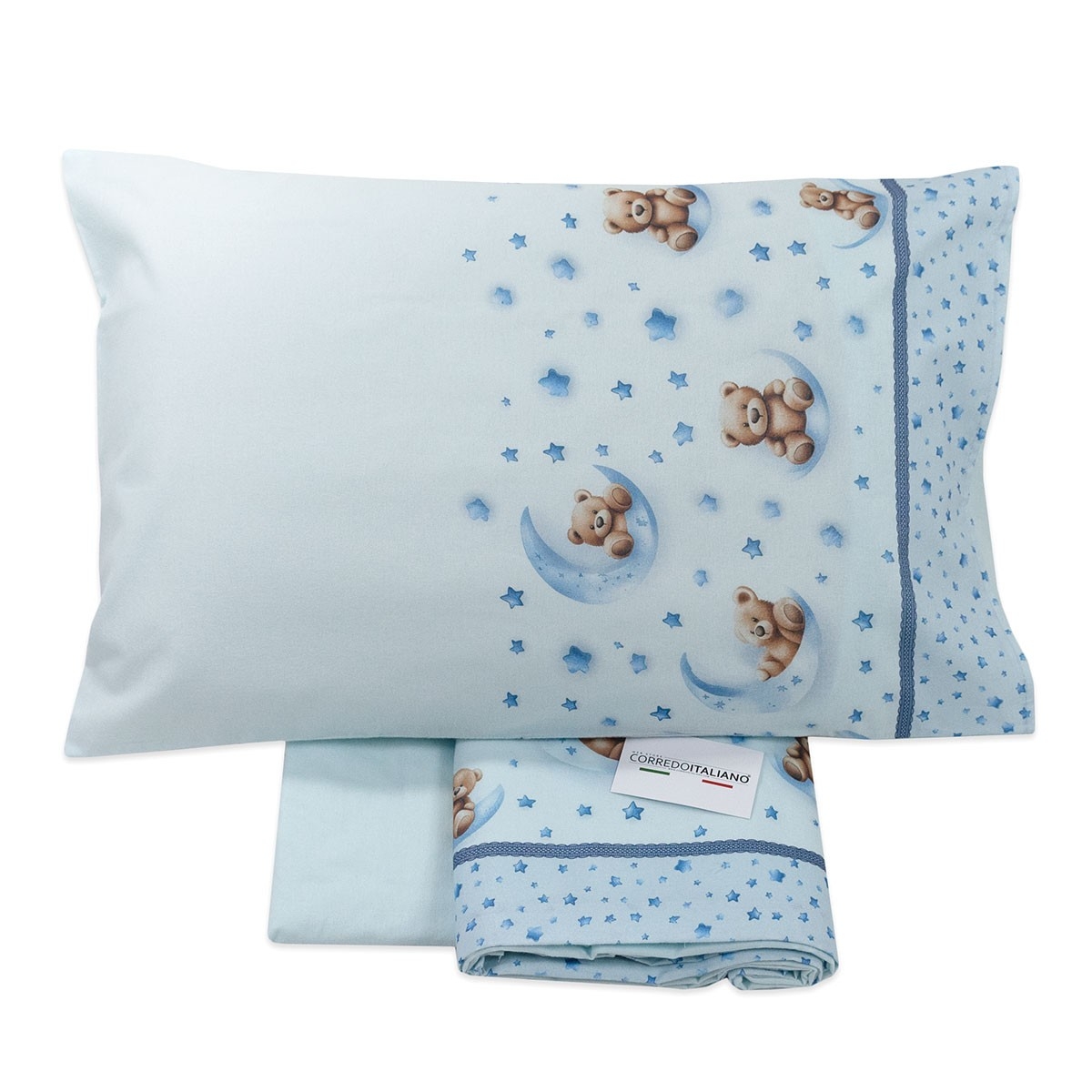 If you are looking for Italian flannel sheets for newborns, the Corredo Italiano set with teddy bear on the crescent moon is the perfect choice: it combines the quality of Made in Italy with a tender and reassuring design, created to cuddle your baby night after night.