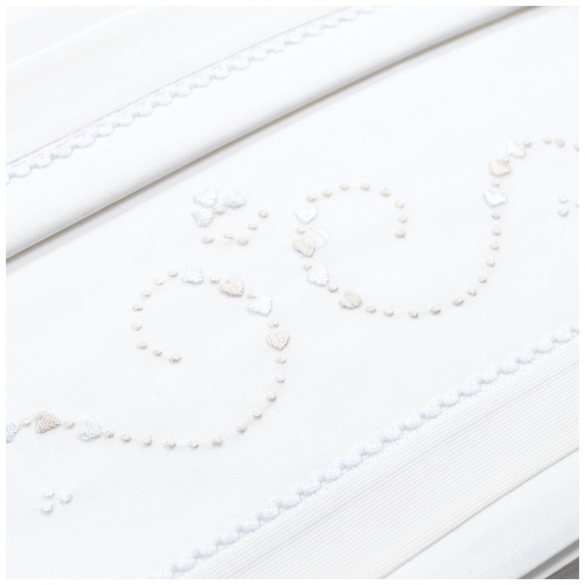 Refined baby cot sheet set hand-embroidered with the utmost artisanal care and made from the finest quality materials. This set, crafted from premium natural cotton, features delicate hand embroidery with tiny hearts and tone-on-tone details, enriched by a refined openwork border. A unique, elegant, and timeless piece — perfect for your baby’s rest and to complete the layette with a touch of Italian-made sophistication.