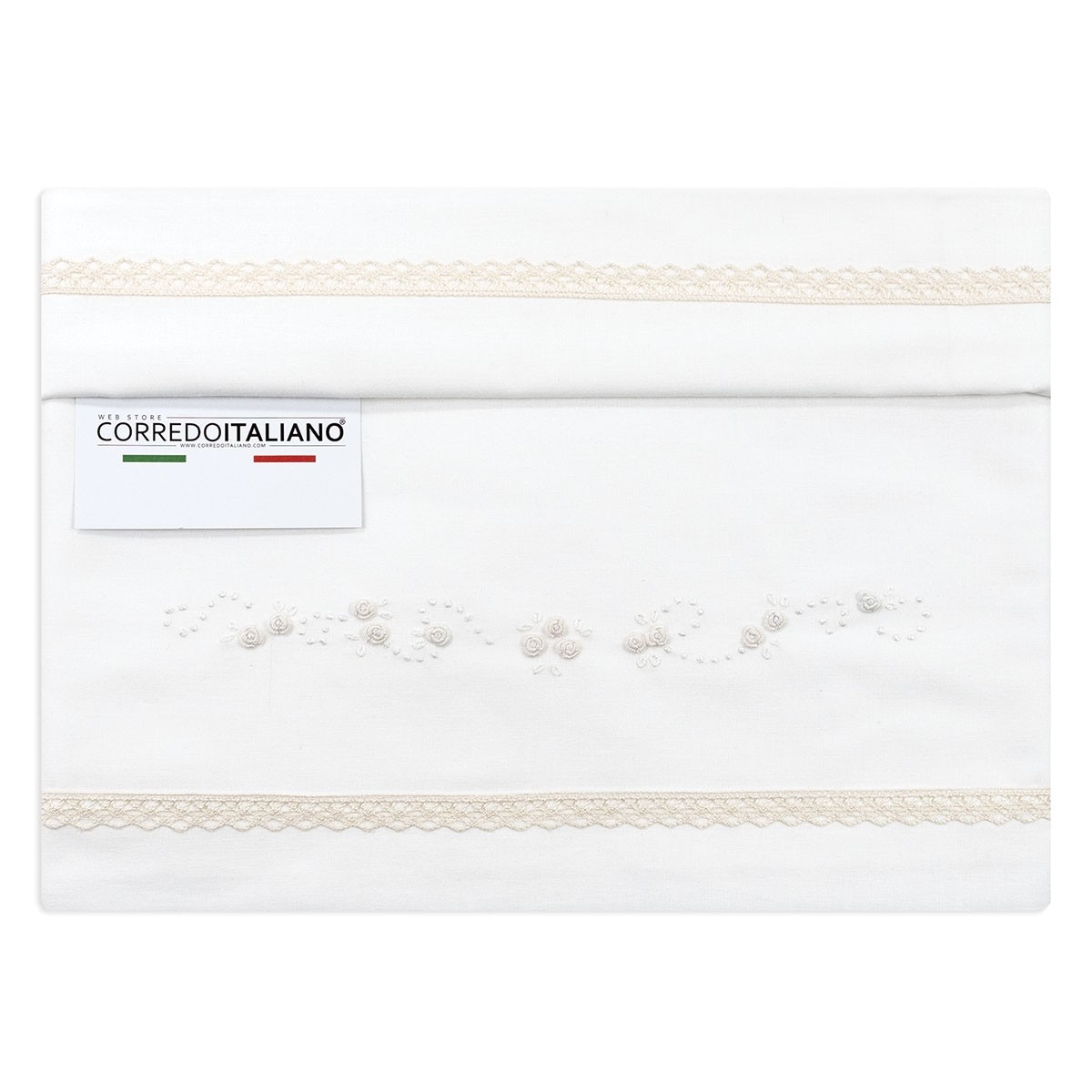 The delicate contrast between ivory and warm cream, combined with the raised embroidered roses, creates a set with discreet yet precious elegance. An ideal choice for those looking for a sheet set for cradle and stroller that combines beauty, comfort, and artisan quality, in true Corredo Italiano style.