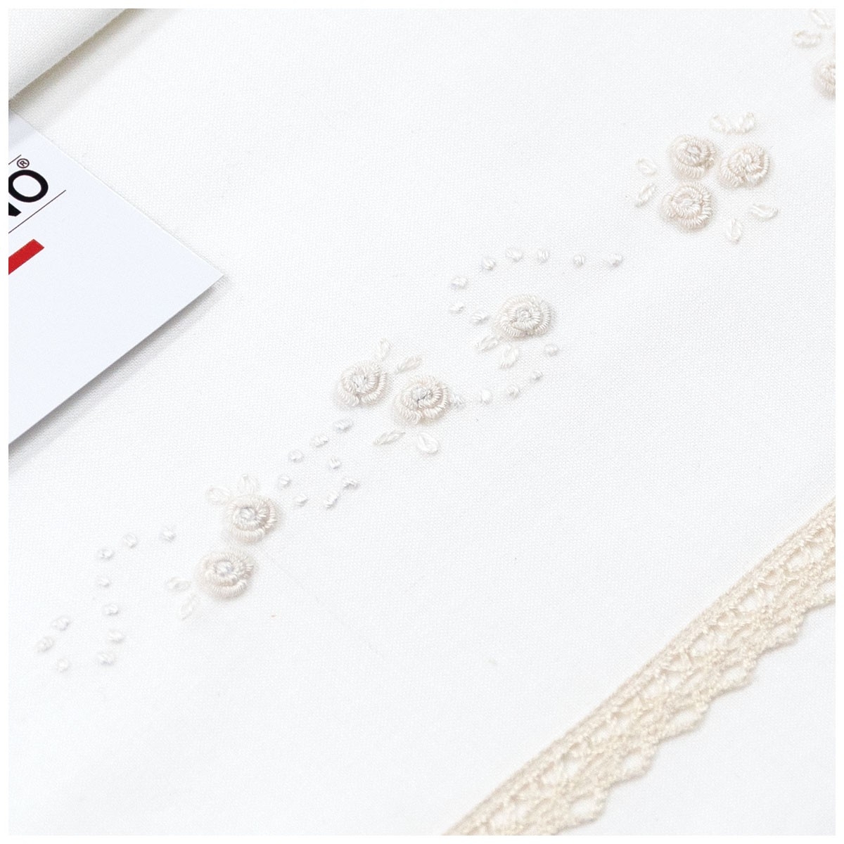 Delicate, bright, and crafted down to the smallest detail: this hand-embroidered sheet set for cradle and stroller is the perfect choice for those who want an elegant, high-quality baby layette. The ivory base is enhanced by a refined cream-colored lace trim and a central embroidery featuring raised little roses, created with a classic and timeless style. Ideal for the first months, it accompanies your baby’s sleep with a feeling of softness and neatness, adorning the stroller or cradle with elegance. Also perfect as a precious newborn gift.
