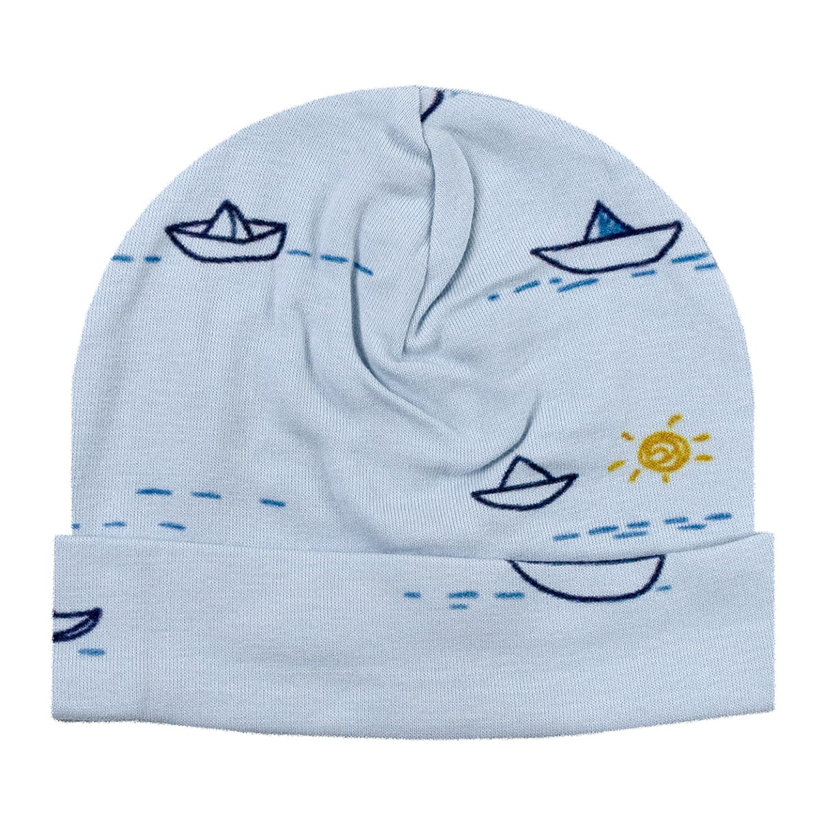 Cap for newborns in jersey cotton with cute boats printed and turned up at the bottom.
