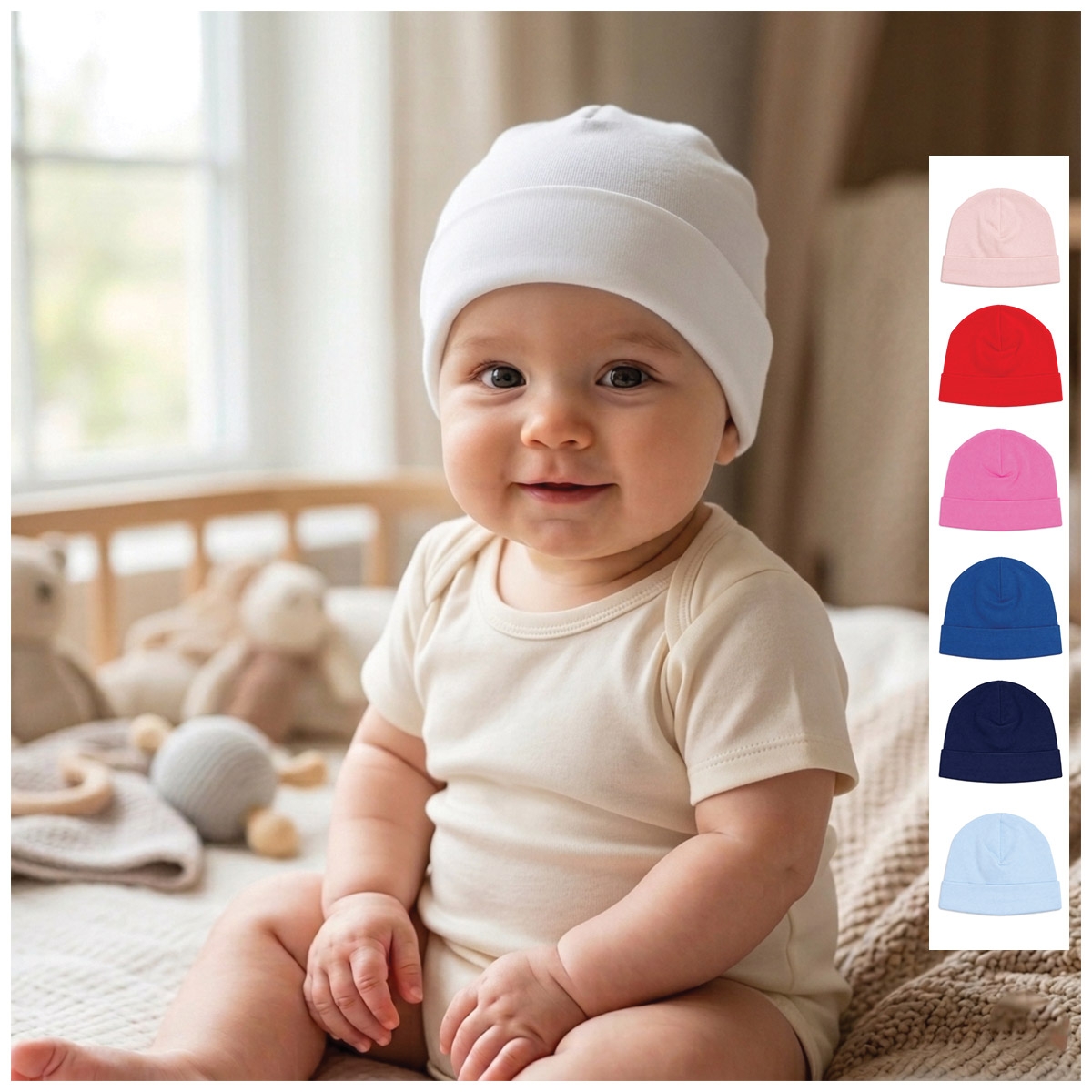 - Elastic fit that gently adapts to the baby’s head