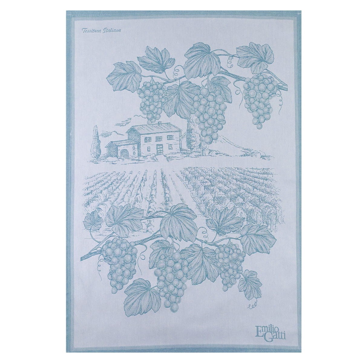 The fabric of the tea towel is an excellent example of resistance and solidity over time, the pattern recalls a beautiful rural panorama with farmhouse and vineyards.