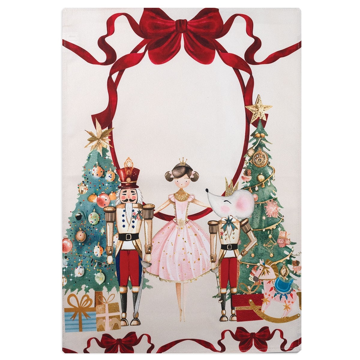 Rectangular tea towel in 100% pure cotton panama with a romantic digital print depicting a ballerina with a little mouse and a toy soldier.