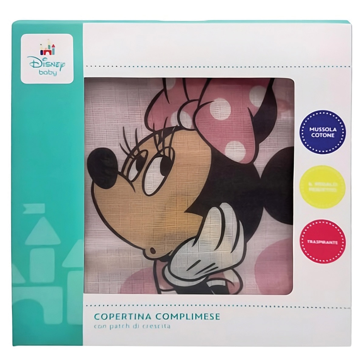A sweet and refined milestone blanket designed to accompany your baby girl throughout her first year of life. Made from soft cotton muslin, gentle and breathable on delicate skin, it is enriched with adorable monthly patches inspired by Minnie. Perfect for creating emotional photo memories, it combines practicality and tenderness in an essential accessory for any newborn layette.