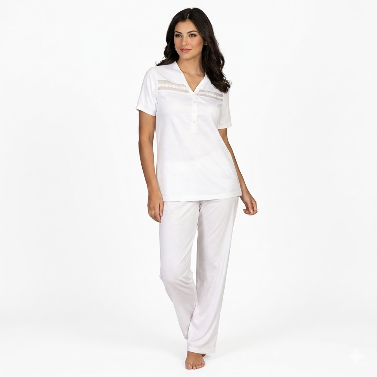 Refined, comfortable and feminine, these women’s pure cotton pyjamas are designed to offer everyday comfort without compromising on style. The short-sleeved top with a 4-button front opening and slightly flared cut makes them ideal also for new mothers or for anyone looking for a practical garment to wear after a bath or during evening relaxation. The delicate little rose appliqués on the openwork insert at bust height add a romantic and elegant touch, turning these pyjamas into a carefully detailed piece that is pleasant to wear.