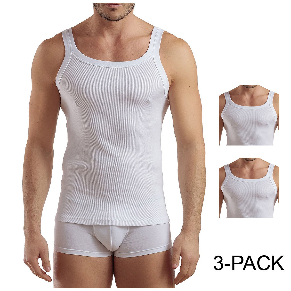Pack of 3 men’s ribbed cotton tank tops with narrow shoulder straps, model Enrico Coveri ET1105. Made from 100% cotton fabric, these tank tops offer a comfortable, close-fitting wear, ideal for everyday use.