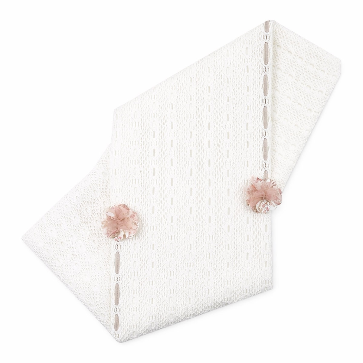 The crochet lace details are carefully crafted to enhance the garment with refined textures. The chiffon floral appliqués are securely attached to ensure long-lasting durability. Soft seams are designed to prevent irritation, providing maximum comfort during the first weeks of life.