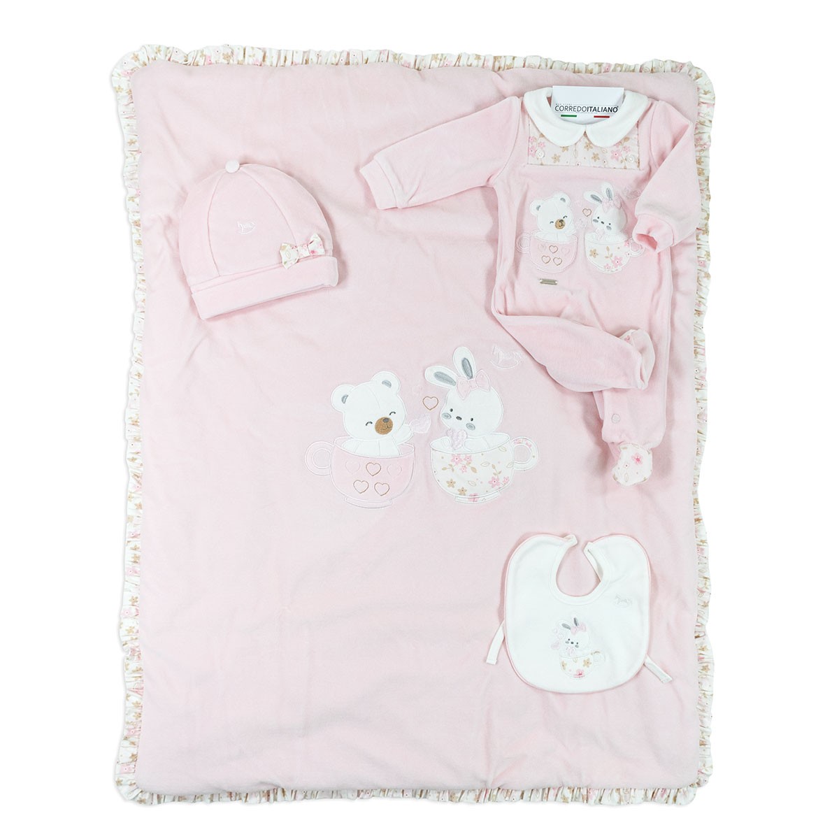 Discover the refined chenille layette gift set for baby girls from the Mio Piccolo collection, designed for her first winter outing. This complete set includes everything you need to welcome your little one with warmth and style: a chenille footed onesie, matching hat, bib, and blanket, all in soft pastel pink and decorated with adorable bunnies and teddy bears. Ideal as a winter newborn layette set with bunnies, and a perfect birth gift idea.
