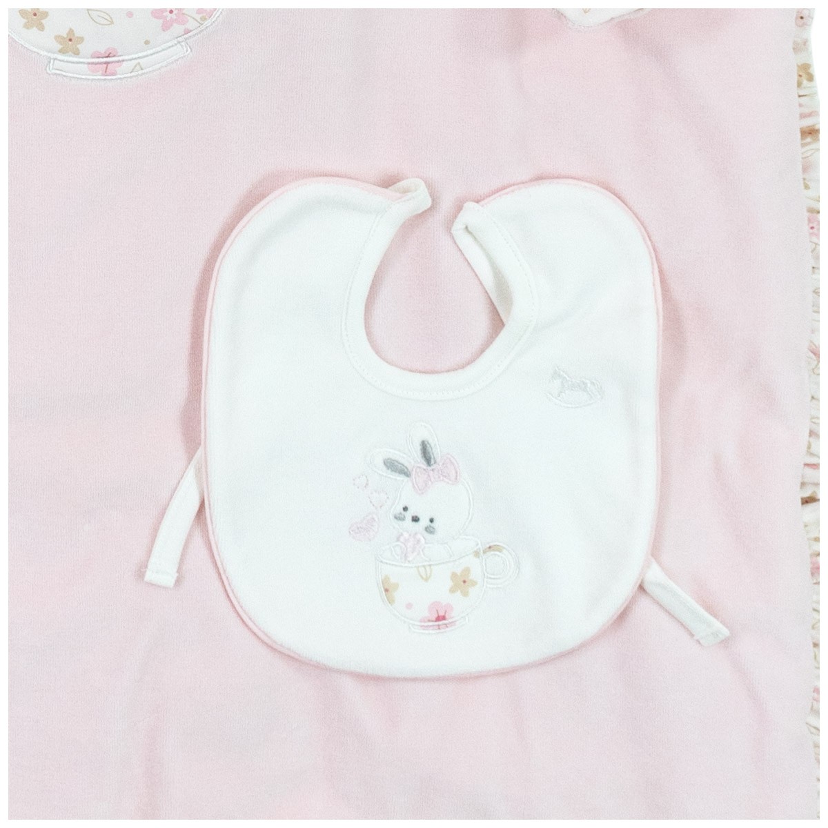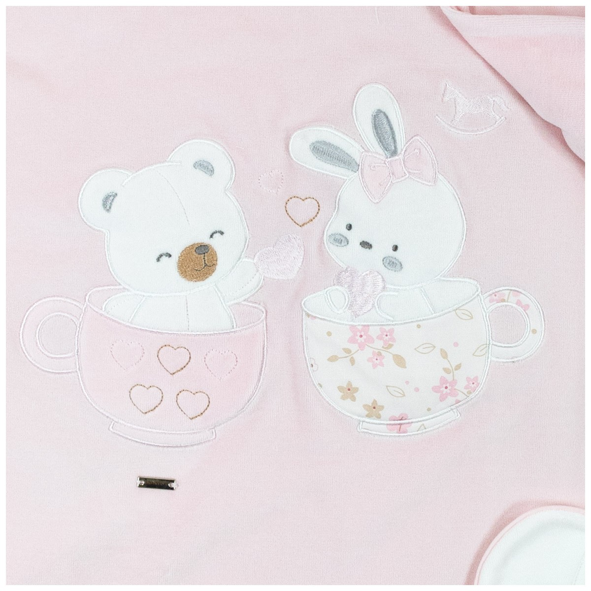 With its soft tones and sweet designs, this newborn chenille layette set is perfect for parents looking for both elegance and functionality. The bunnies inside teacups add an unforgettable fairytale touch.