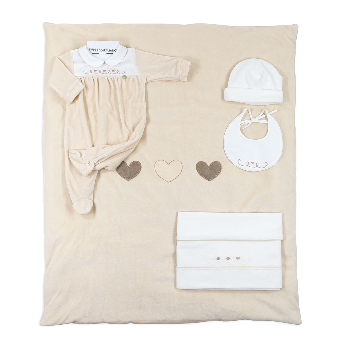The Coccode' Firenze baby girl layette set is the perfect choice for the first trip home from the hospital, welcoming your little one with sweetness and elegance. This refined chenille set includes a long-sleeved onesie, hat, matching bib, blanket and embroidered sheet, all decorated with romantic little hearts. Designed to ensure comfort and practicality during the first days of life, it combines Italian style and artisanal quality, offering parents a safe and soft garment for the delicate skin of newborns.