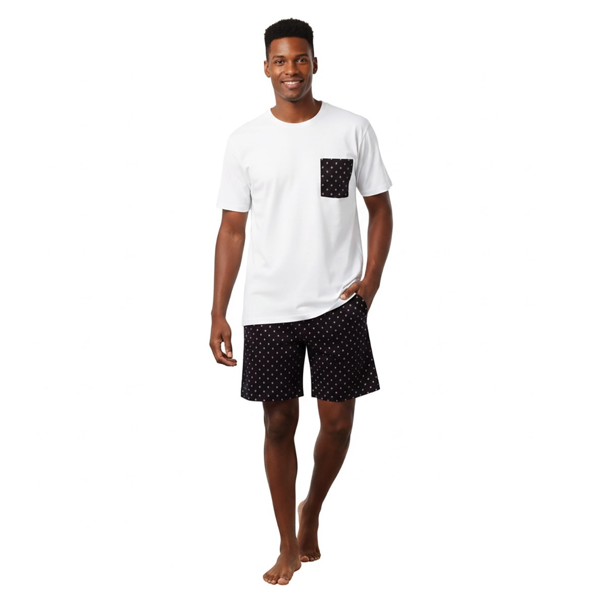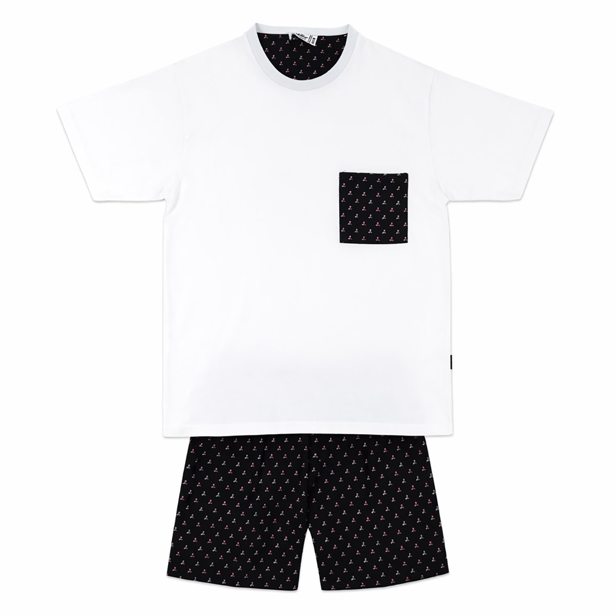 The contrast between the minimal white T-shirt and patterned shorts creates visual balance and a modern look, making this pajama set practical yet refined in detail.