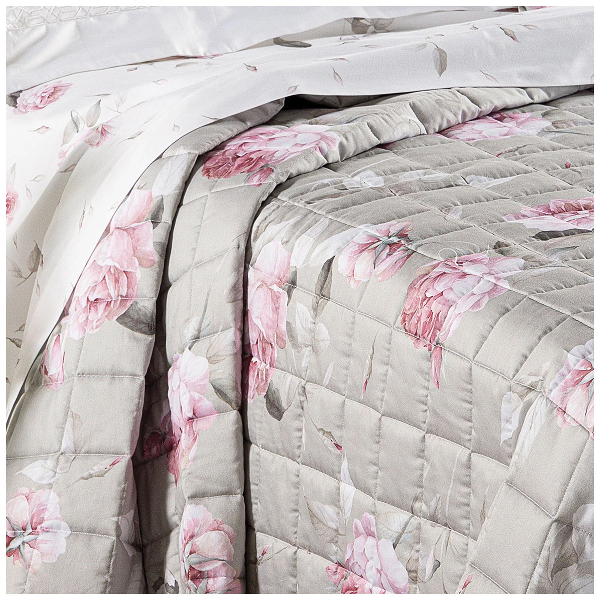 The cotton sateen surface enhances the floral print with a bright and elegant appearance. The quilted workmanship gives structure to the bedspread, improves the fit on the bed, and helps ensure a more even distribution of the padding. The result is a well-finished piece designed to accompany the bedroom routine with style.