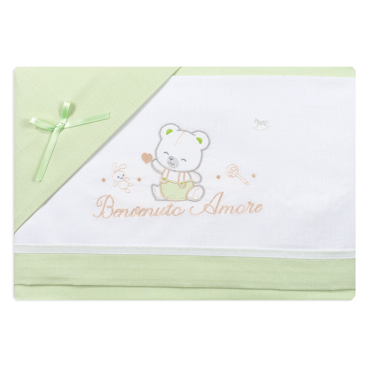 Made of high-quality cotton, it is embellished with a cute embroidered teddy bear with the words “Benvenuto Amore” (“Welcome, Love”) and delicate details. Ideal for both the pram and the crib, this set combines elegance and comfort, becoming an essential accessory for your baby’s layette.