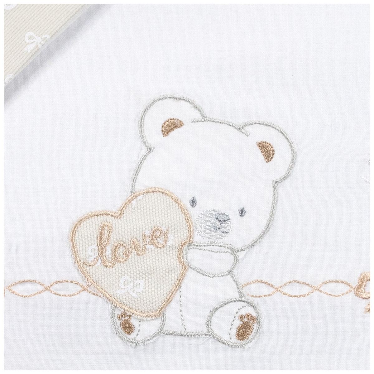 This baby crib sheet with teddy bear and heart embroidery is designed to dress the crib with sweetness and refinement during the first months of life. The delicate design, enhanced by a central embroidery featuring a teddy bear and the word “Love”, adds a tender and harmonious touch to the nursery bedding. Coordinated appliqués with bows and decorative trims enrich the item without weighing it down, making it perfect for everyday use as well as for elegant newborn layettes. The cotton fabric ensures comfort, breathability and respect for the baby’s sensitive skin.