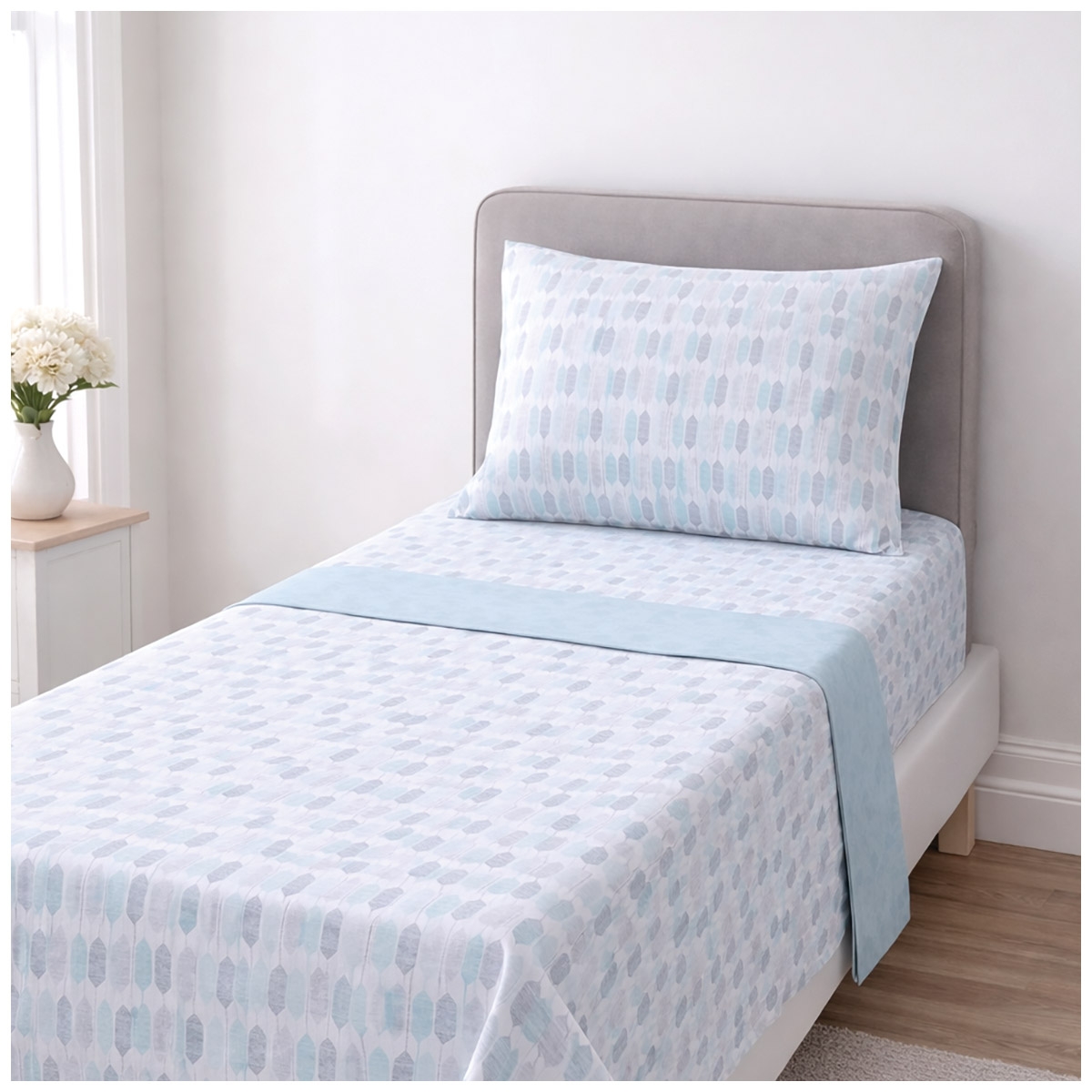 The Capua cotton bed sheet set for a single bed is designed to provide comfort, quality, and a delicate style to the bedroom. Made from soft cotton, this sheet set combines everyday practicality with attention to textile details. The refined pattern in shades of light blue and grey adds an elegant and relaxing touch, perfect for modern bedrooms, kids’ rooms, or guest rooms.