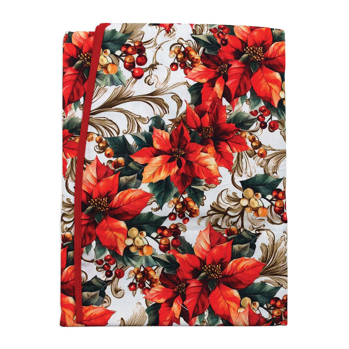 Made from refined 100% cotton fabric, it features a vibrant Christmas pattern with poinsettias, red berries, and golden decorations, perfect for creating a warm and joyful atmosphere during the holidays.
