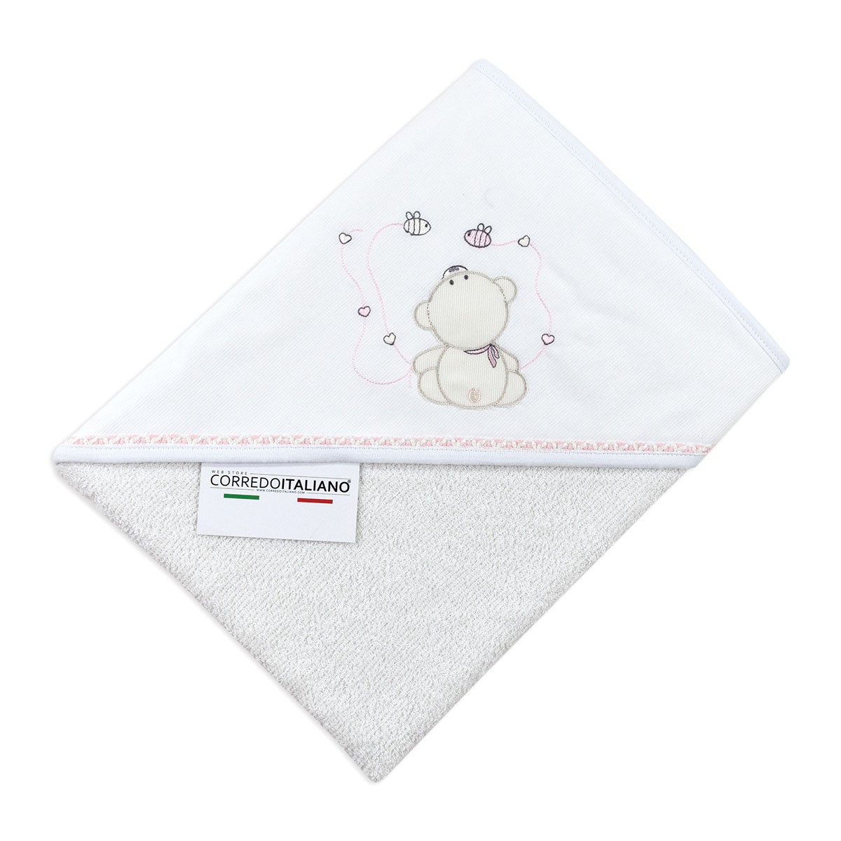 Made of pure cotton terry cloth and embellished with an adorable bear and bees embroidery, this hooded embroidered towel ensures maximum absorbency and softness on the delicate skin of newborns.