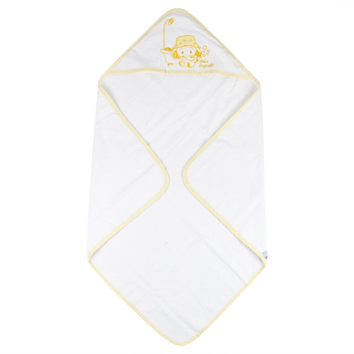 Accappatoio per neonati di forma quadrata con angolo a cappuccio arricchito da un simpatico elefantino ricamato a rilievo.