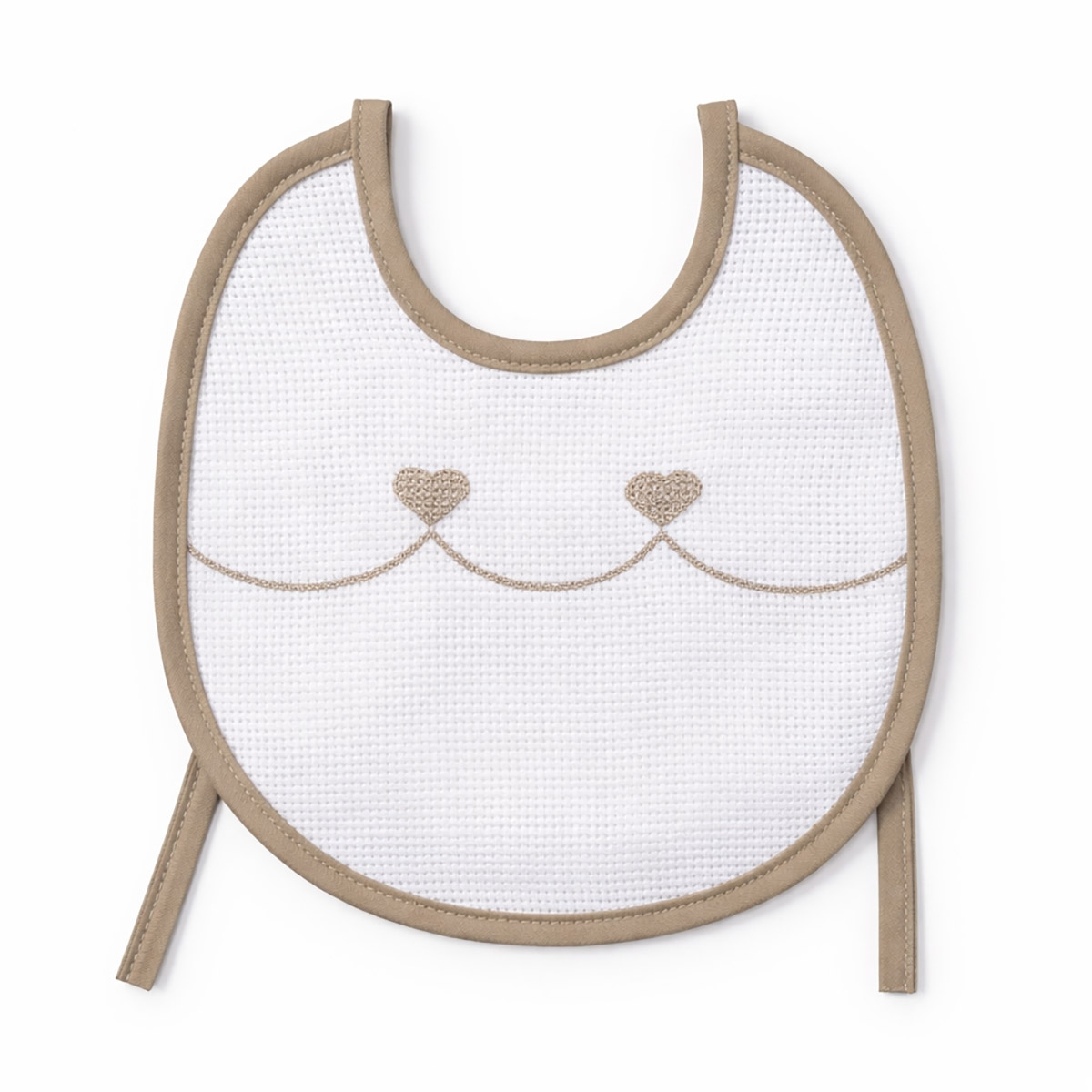 Realizzato in puro cotone di alta qualità, il bavaglino garantisce una naturale traspirabilità e una piacevole sensazione sulla pelle. La lavorazione della tela Aida frontale è studiata per facilitare il ricamo, mantenendo al tempo stesso resistenza e stabilità nel tempo. Il prodotto è ideato, tessuto e confezionato in Italia, a garanzia di cura artigianale e attenzione ai dettagli.