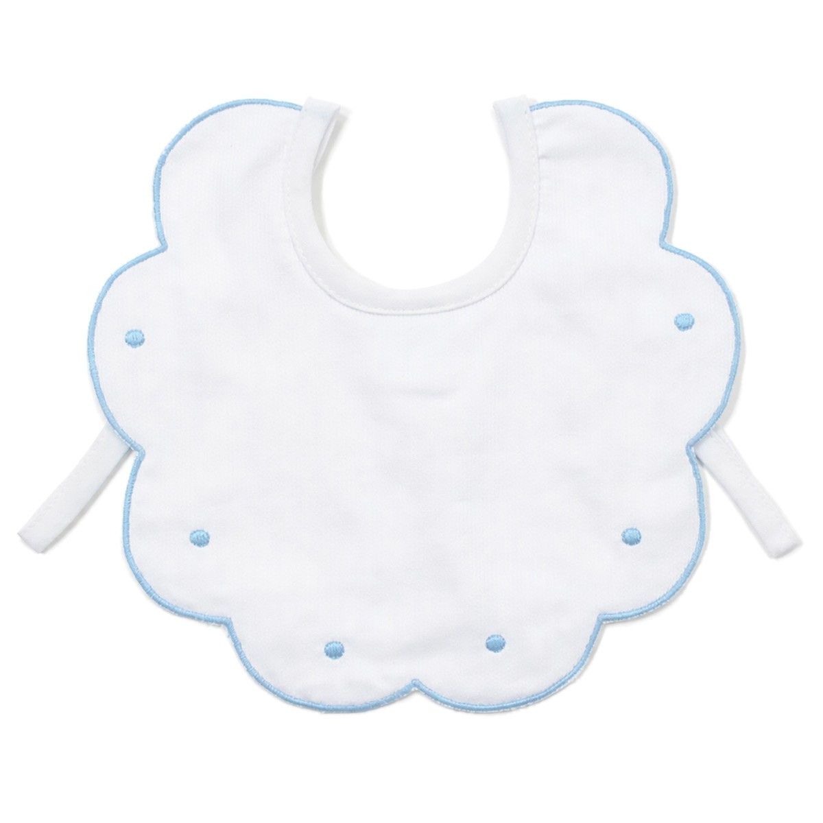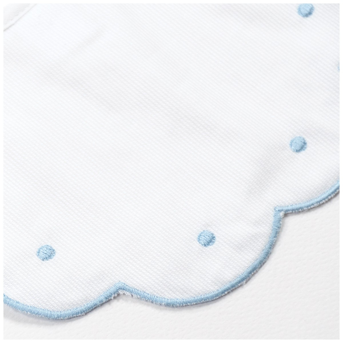 Ogni bavaglino è rifinito con cura sartoriale: i bordi sagomati sono impreziositi da un profilo ricamato, mentre i piccoli pois decorativi donano movimento senza risultare invasivi. Le cuciture precise garantiscono resistenza ai lavaggi frequenti, mantenendo nel tempo forma e bellezza. Il ricamo è realizzato con filati delicati, studiati per restare morbidi a contatto con la pelle sensibile del neonato.