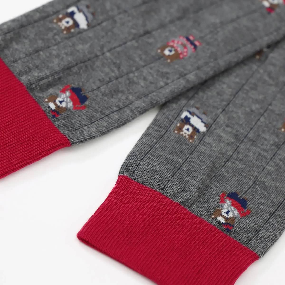 Disegno di piccoli orsetti con sciarpa su sfondo grigio a contrasto con punta e tallone di colore rosso.