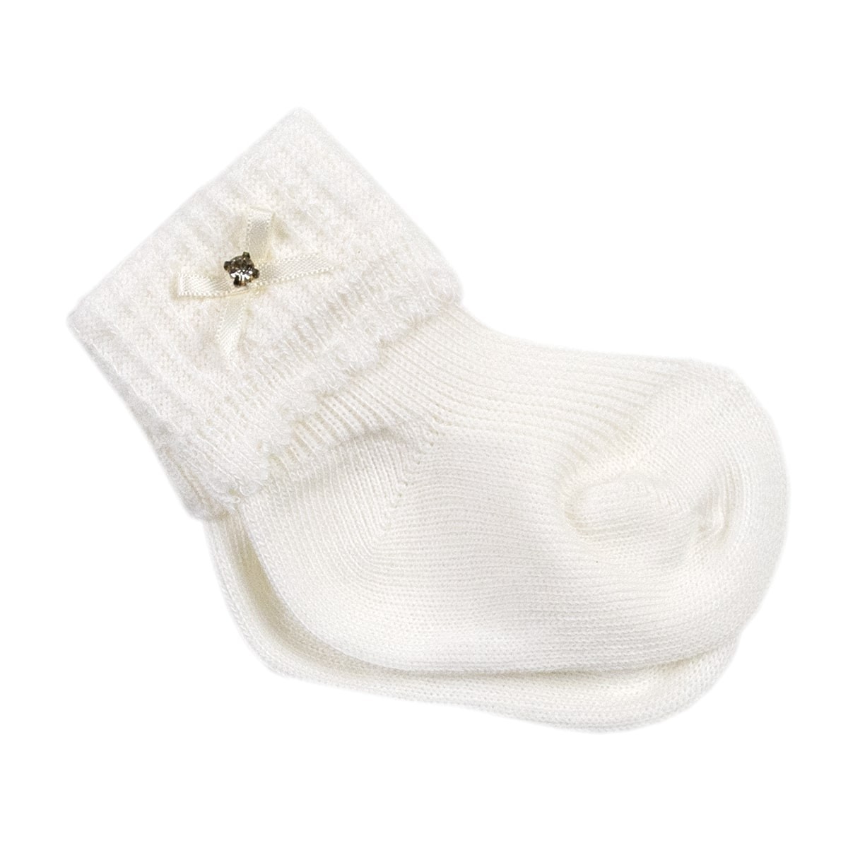 Calzini per neonati in 100% puro cotone invernale, il modellino è particolareggiato da un delicato risvoltino con fiocchetto e brillantino.