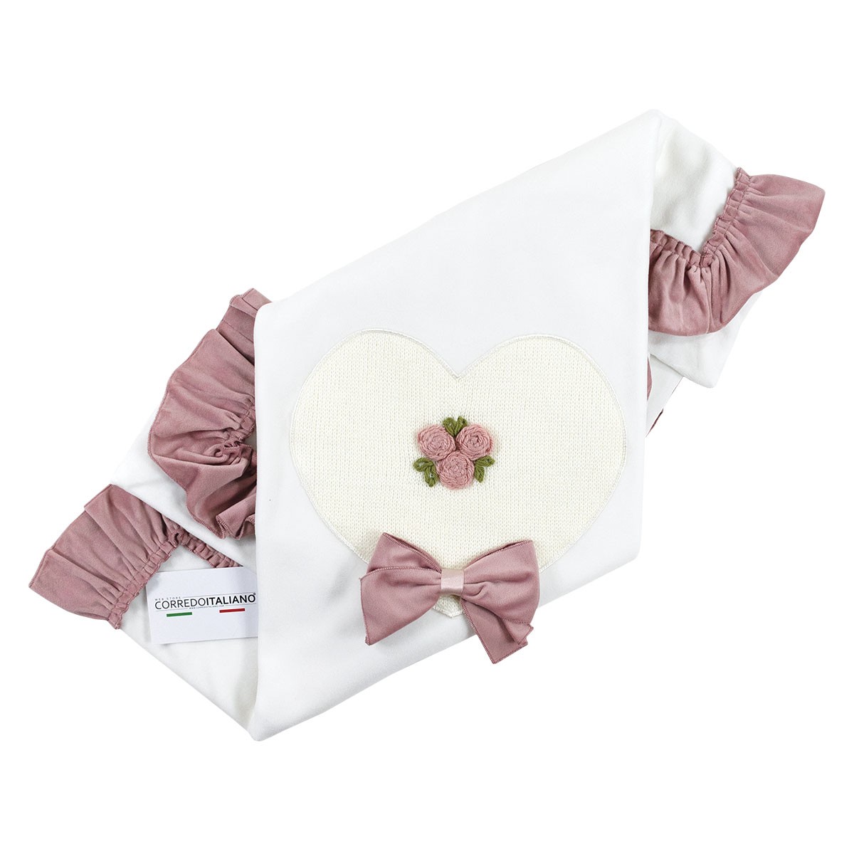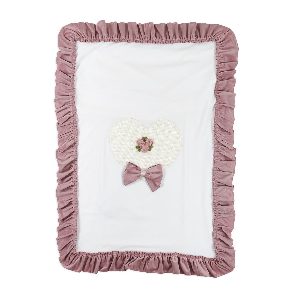 Elegante copertina per neonato firmata Teneri e Belli, con cuore centrale ricamato a maglia, fiocco decorativo e volant rosa antico: un accessorio dolce e raffinato per il corredino.