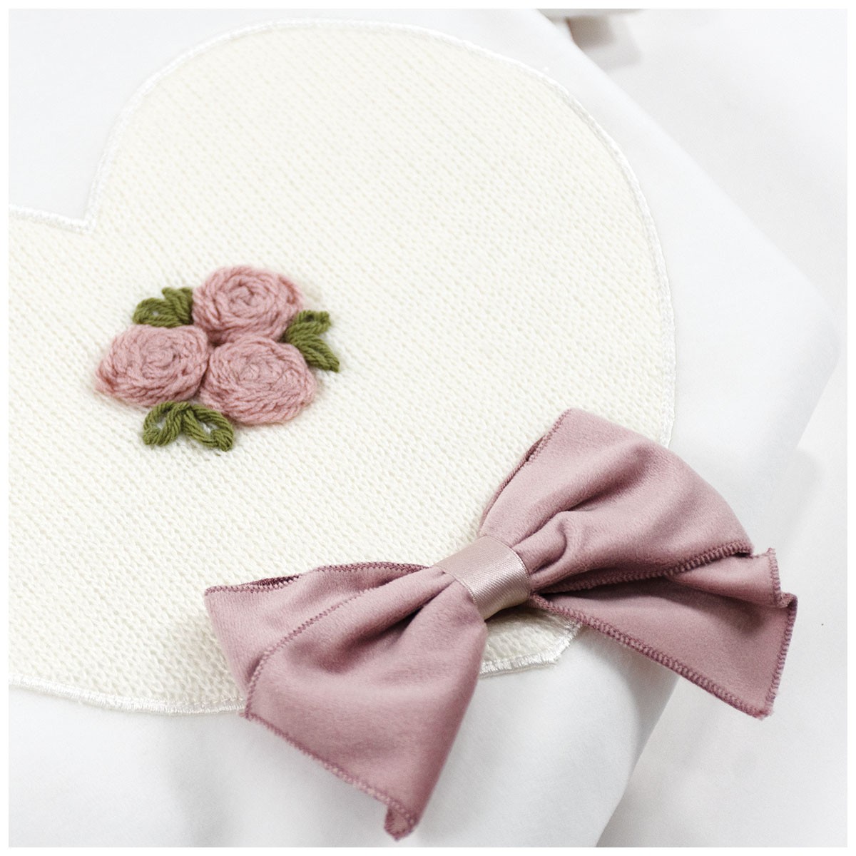 Il cuore centrale, realizzato con tessuto a trama naturale, è impreziosito da un ricamo floreale con roselline rosa dello stesso tessuto a maglia. Il fiocco applicato e i volant laterali in rosa antico aggiungono un tocco romantico, perfetto per corredini da neonata.