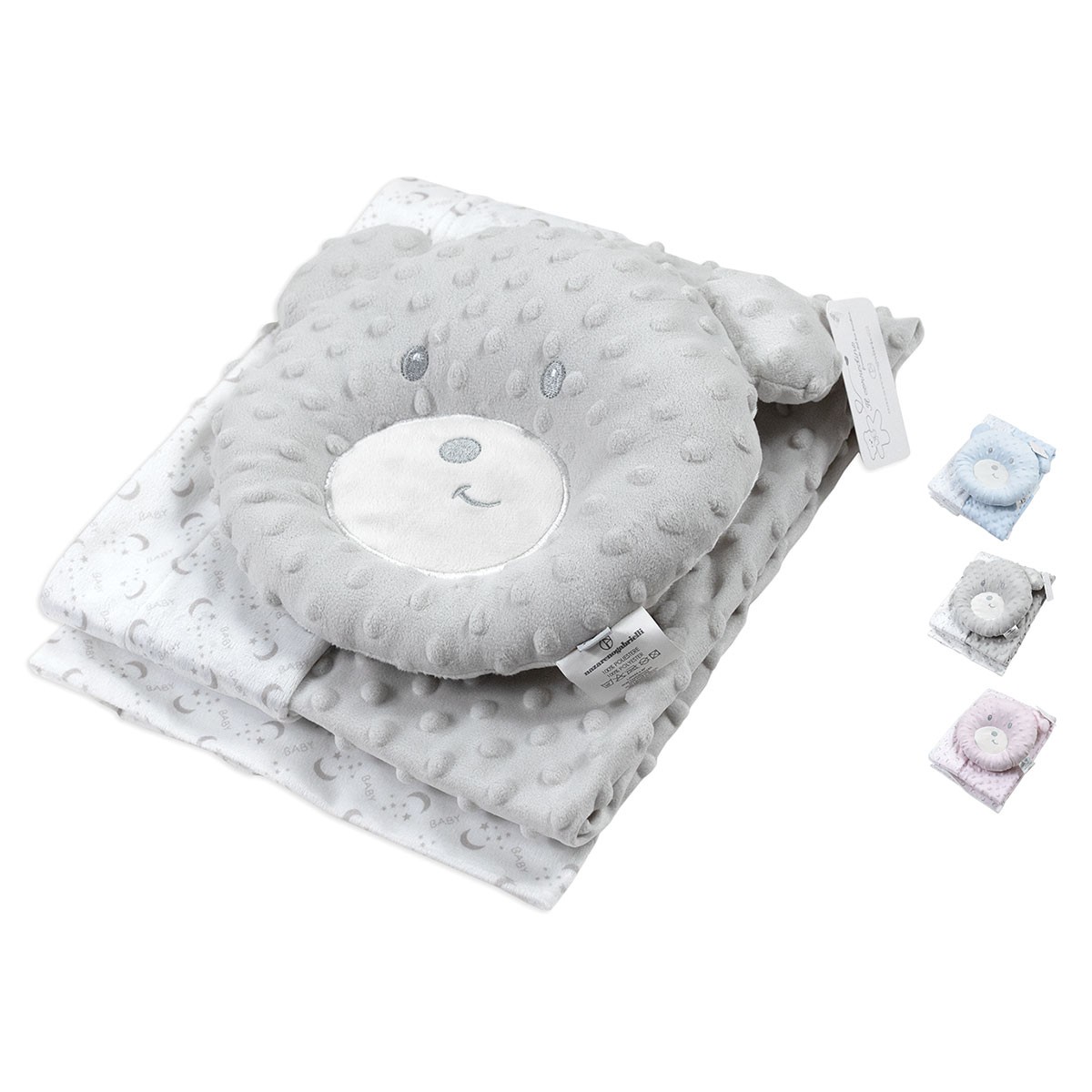 Simpatico set copertina per culla in pile della collezione Nazareno Gabrielli, completo di cuscino a forma di orsetto: una soluzione ideale per garantire comfort e sicurezza al tuo neonato.