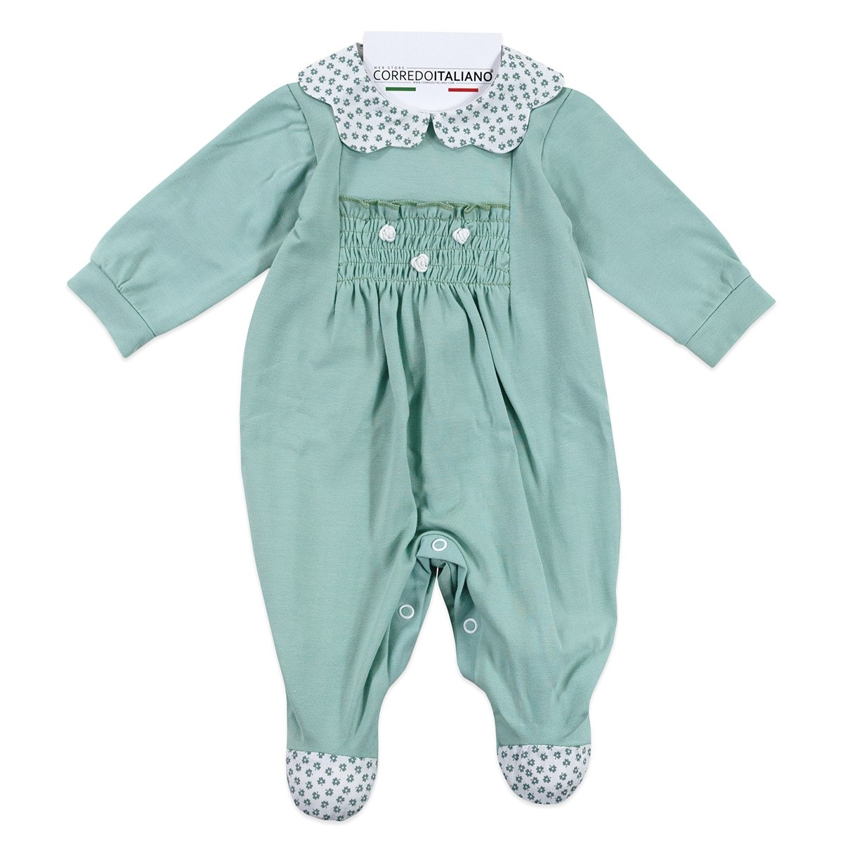 Set corredino neonata in cotone jersey verde salvia, morbido e traspirante, con dettagli raffinati. Completo nascita e prima uscita Made in Italy.