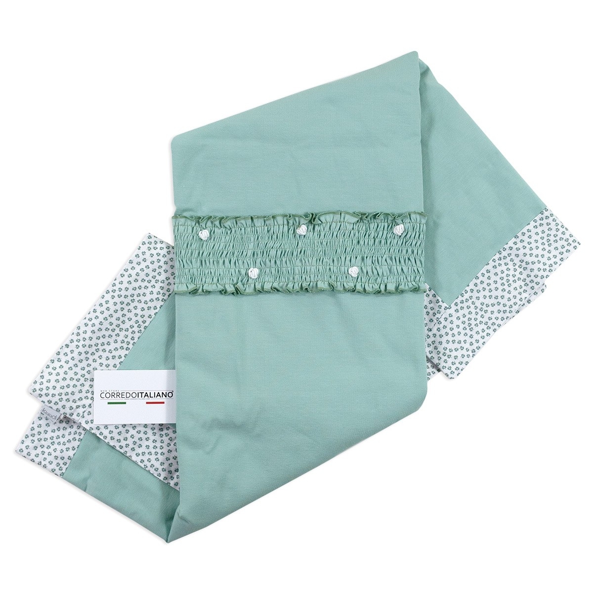 Il set è impreziosito da delicate lavorazioni artigianali, con arricciature elasticizzate e piccoli dettagli decorativi che valorizzano il capo senza rinunciare alla funzionalità. Le finiture curate testimoniano l’attenzione al dettaglio tipica della tradizione tessile italiana.
