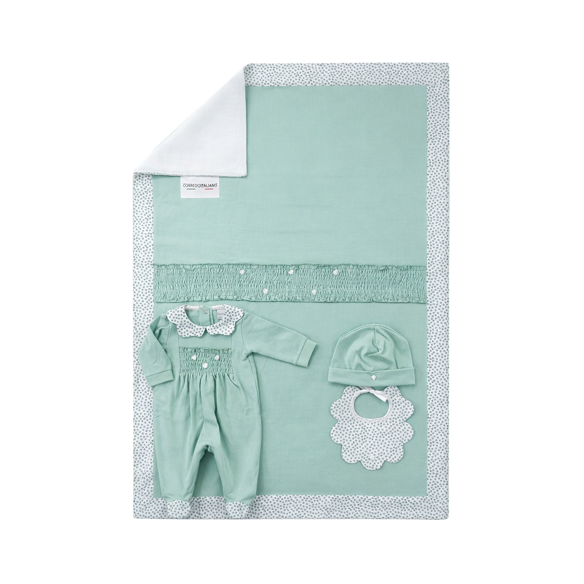 - Composizione set: tutina tg. 0 = 1 mese (56 cm) + copertina 70x95 cm + cappellino (tg. unica) + bavaglino (16x18 cm)