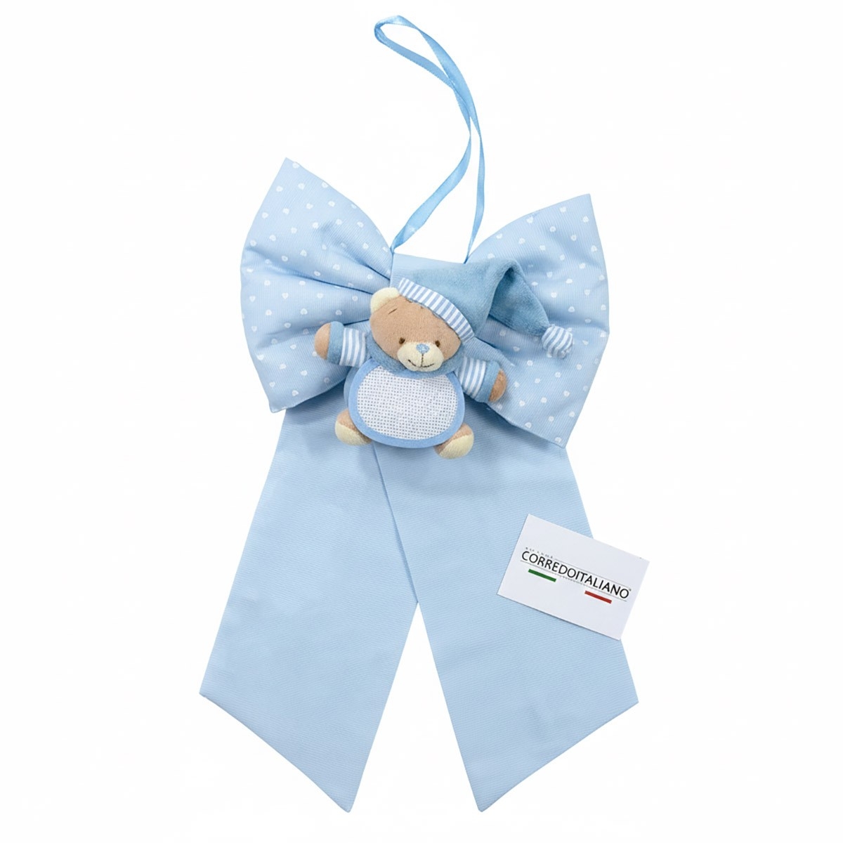 Fiocco nascita per neonato realizzato in 100% tessuto di puro cotone con un grazioso orsetto centrale con bavetta in tela aida centrale ricamabile.